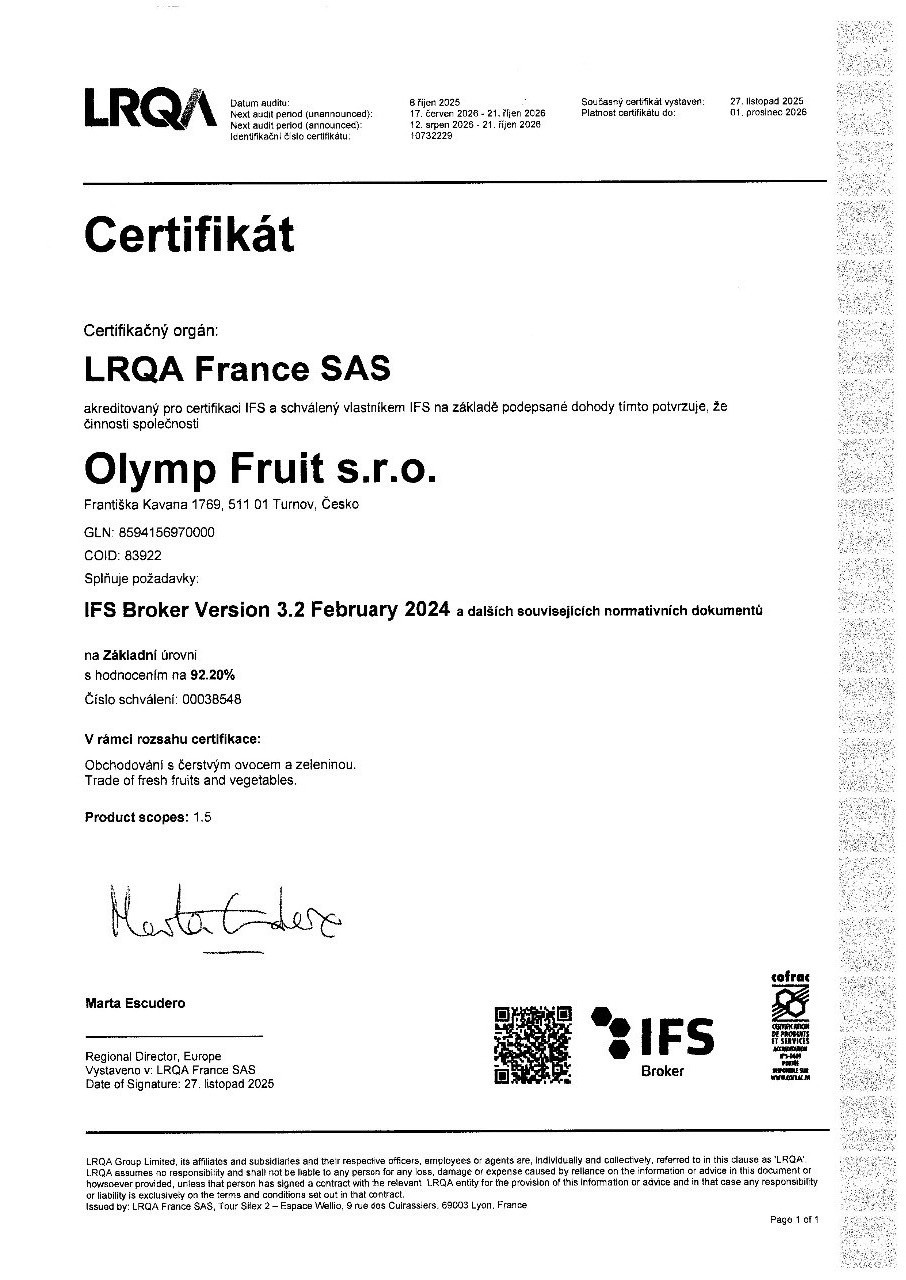 Od vstupu na trh v březnu 2006 se naše firma vždy snažila o co nejkvalitnější dodávky co nejkvalitnějšího ovoce a zeleniny, vypracovali jsme si pro to určité firemní postupy. V roce 2019 jsme se v rámci neustálého zlepšování rozhodli zavést systém managementu a získat certifikaci podle normy ISO 9001 o systému řízení kvality. Koncem roku 2021 jsme se rozhodli pro certifikaci IFS Broker, která se zaměřuje přímo na obchod s potravinami. Certifikační proces byl úspěšně dokončen v říjnu 2022.